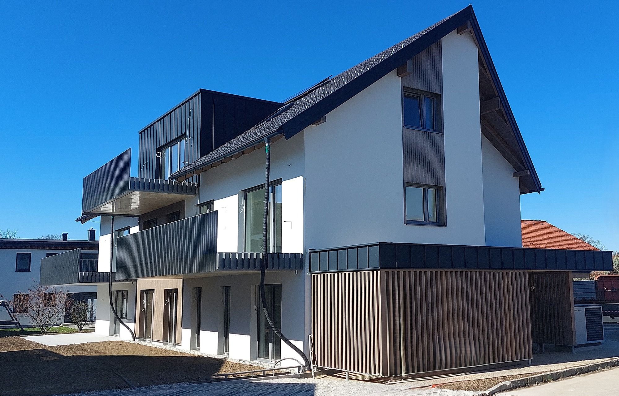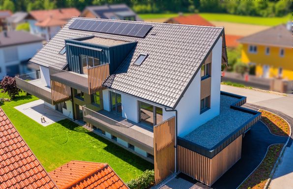 Hochwertige Beläge wie beispielsweise die verwendete Landhausdiele (INKU Eiche Country), Sanitärgegenstände von Laufen, Geberit, Hoesch und hansgrohe zeichnen die hohe Qualität im Inneren des Gebäudes aus - moderne Fenster mit Alu-Deckschale aus der designorientierten Linie INTERNORM „pure“ in Kombination mit einem Sonnenschutz von newo tragen diesen Qualtiätsanspruch nach außen.